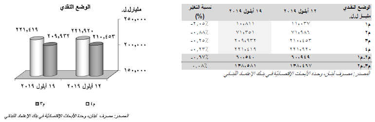 All monetary aggregates ended the week of September 19, 2019 on a negative note. In fact, the overall money supply, “M4”, plunged by LBP 500.72 billion on a weekly basis and by 1.07% on an annual basis to LBP 221,419 billion, noting that the non-banking sector’s Treasury bills portfolio increased by LBP 20 billion during the concerned week.