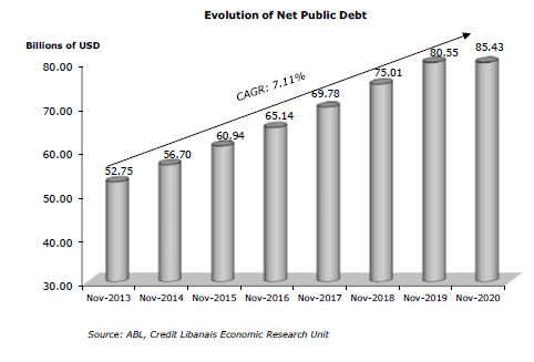 The compounded annual growth rate in Lebanon’s net public debt stood at 7.11% over the November 2013 – November 2020 period as captured by the chart below: