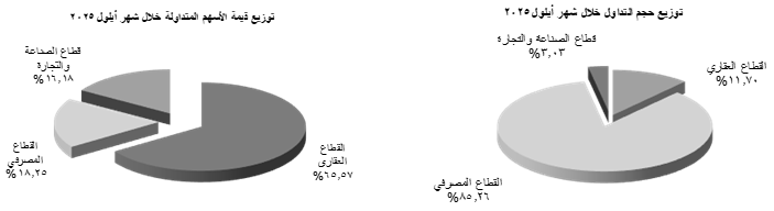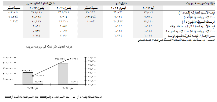 تراجعت حركة التداول على بورصة بيروت بشكلٍ لافت خلال الشهر التاسع من العام 2025 حيث إنخفض عدد الأسهُم المُتداوَلة بنسبة 23.46% على صعيد شهريّ إلى 2،131،108 سهم مقارنةً ب2،784،318 سهم في الشهر الذي سبقه في حين إرتفعت قيمة الأسهُم المُتداوَلة بنسبة 31.92% إلى 29.04 مليون د.أ.، من حوالي 22.01 مليون د.أ. في الشهر الذي سبقه. وقد تركّزت الحصّة الأكبر من التداول في أسهم القطاع المصرفي الذي إستحوذ على 85.26% من مجموع عدد الأسهُم المُتداوَلة، تبعته أسهم القطاع العقاري (11.70%) وأسهم قطاع الصناعة والتجارة (3.03%). أمّا فيما يخصّ الرسملة السوقيّة للبورصة، فقد زادت هذه الأخيرة بنسبة 6.55% خلال شهر أيلول إلى حوالي ال20.93 مليار د.أ. علماً أنّها سجّلت تراجعاً سنويّاً بنسبة 1.96% عند مقارنتها بالمستوى الذي كانت عليه في شهر أيلول 2024 والبالغ حينها حوالي 21.35 مليار د.أ. يُعزى الإرتفاع الشهريّ في الرسملة السوقيّة إلى التحسّن في أسعار أسهم ذو رسملة سوقيّة عالية كأسهم سوليدير "أ" (زيادة شهريّة بنسبة 10.17%) وأسهم سوليدير "ب" (إرتفاع شهريّ بنسبة 12.67%) ما طغى على التراجع الشهريّ في سعر أسهم هولسيم لبنان (إنخفاض شهريّ بنسبة 4.00%).