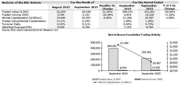 On an annual basis, the number of shares traded on the BSE rose by 71.33% in the first nine months of 2025 to 14.23 million shares while the traded value plummeted by 43.84% to $221.42 million. As far as trading multiples are concerned, the weighted average Price to Book Value (P/BV) multiple of listed stocks ended the last trading day of September 2025 higher at 6.784x compared to 6.029x in August, noting that it stood at 7.195x in September 2024 at a time when the prices of heavy market-cap weighted Solidere “A” and “B” shares were trading at $91.00 and $94.65 respectively, compared to closing prices of $85.05 for Solidere “A” shares and $84.95 for “Solidere “B” shares at end of September 2025.