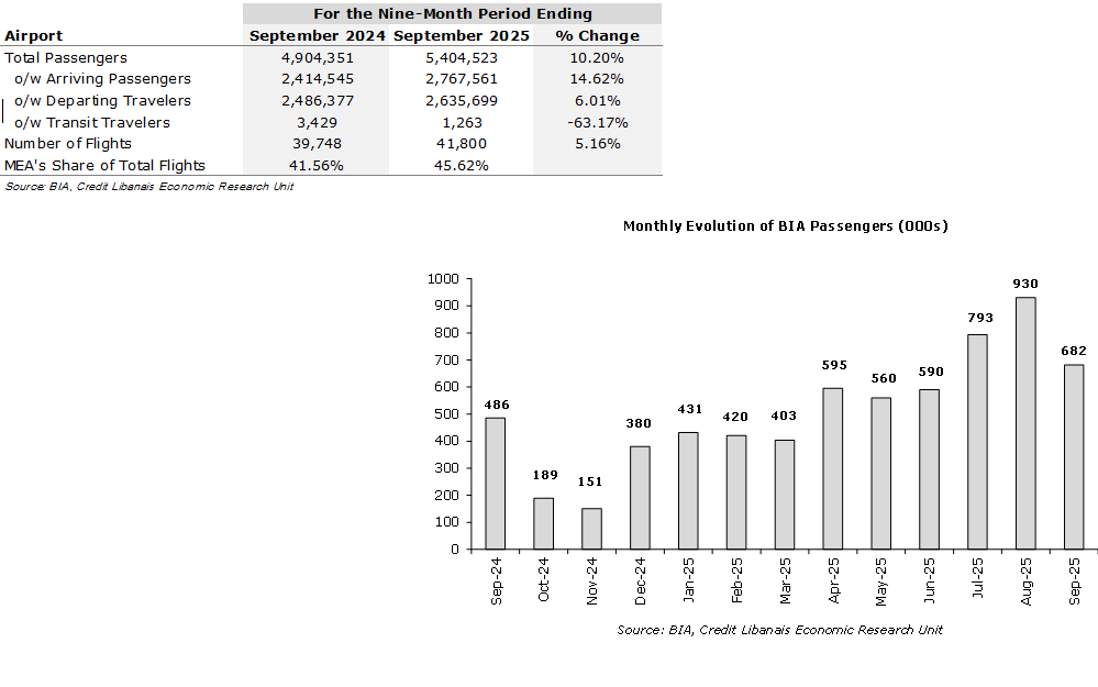 The number of passengers via the Beirut International Airport stood at 681,693 in September 2025, down by 26.70% month-on-month yet came in 40.35% y-o-y higher when compared to September 2024’s reading of 485,699. The ratio of departing to arriving passengers stood at 1.30x in September compared to 1.34x in August and 0.67x in July as most expatriates and tourists continued returning to their country of residence ahead of schools/universities reopening. On a cumulative basis, the number of passengers rose by 10.20% in the first nine months of 2025 to around 5.40 million, up from 4.90 million passengers in the same period in 2024. More specifically, the number of arriving travelers decreased by 25.31% m-o-m while increasing by 14.62% on an annual basis to 2.77 million YTD September, with the number of departing travelers ebbing by 27.74% m-o-m yet increasing by 6.01% y-o-y to 2.64 million. The number of transit travelers decreased by 35.77% m-o-m and by 63.17% over the same period in 2024 to 1,263 YTD September 2025. The number of flights saw a sharp monthly decrease of 21.51% in September and an annual rise of 5.16% during the first nine months of 2025 to 41,800. It is worth highlighting in this context that the share of Middle East Airlines (MEA) rose from 41.56% of the total number of flights in the first nine months of 2024 to 45.62% in the same period in 2025. This is further sketched in the section below: