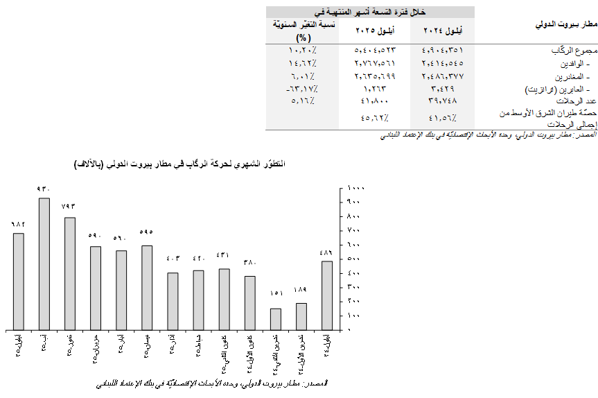 إنخفض عدد المسافرين عبر مطار بيروت الدولي بنسبة 26.70% في شهر أيلول 2025 إلى 681،693 في حين زاد بنسبة سنويّة بلغت 40.35% مقارنةً بالمستوى المسجّل خلال شهر أيلول 2024 والبالغ 485،699. وقد وصل معدّل المسافرين المغادرين كسنبةً من المسافرين القادمين إلى حوالي ال1.30 في أيلول مقارنة ب1.34 في آب و0.67 في تمّوز، مع إستمرارعودة معظم المغتربين/السيّاح إلى بلادهم مع إعادة فتح المدارس والجامعات. على صعيد تراكمي، إرتفع عدد المسافرين بنسبة 10.20% سنويّاً في الأشهر التسعة الأولى من العام 2025 إلى حوالي 5.40 مليون مسافر مقارنةً بحوالي 4.90 مليون مسافر في الفترة نفسها من العام 2024. في التفاصيل، تراجع عدد الوافدين إلى لبنان بنسبة 25.31% على أساس شهريّ في حين زاد بنسبة 14.62% على أساسٍ سنويٍّ إلى 2.77 مليون مسافر حتّى شهر أيلول الحالي. بالإضافة إلى ذلك، إنكمش عدد المغادرين بنسبة 27.74% على صعيد شهريّ في حين إرتفع بنسبة 6.01% على صعيد سنوي إلى 2.64 مليون مسافر في نهاية الأشهر التسعة الأولى من العام 2025. وقد إنخفض عدد العابرين عبر مطار بيروت (ترانزيت) بنسبة 35.77% على صعيد شهريّ وبنسبة 63.17% على أساس سنويّ إلى 1،263 مسافر حتّى شهر أيلول 2025. أمّا فيما يخصّ حركة الملاحة فقد سجّل عدد الرحلات الجويّة إنخفاض شهريّ بلغت نسبته 21.51% في آب وزيادة سنويّة بلغت نسبتها 5.16% خلال فترة الأشهر التسعة الأولى من العام 2025 إلى 41،800. يجدر الذكر أنّ حصّة طيران الشرق الأوسط من إجمالي عدد الرحلات قد تحسّنت من 41.56% في نهاية الفصل الثالث من العام 2024 إلى 45.62% في الفترة الموازية من العام 2025 كما هو مبيّن أدناه: