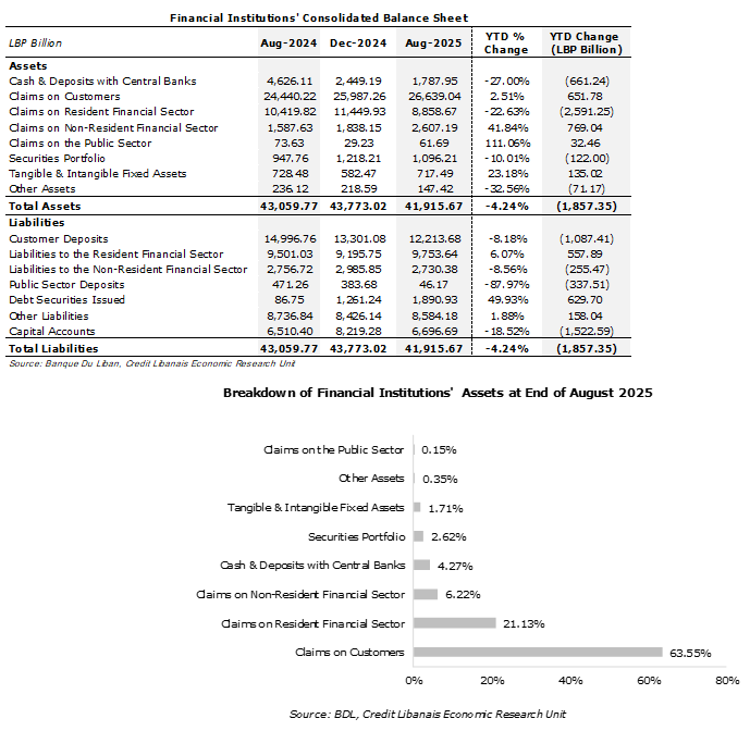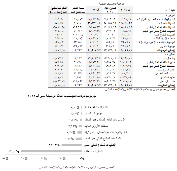 إستناداً إلى إحصاءات مصرف لبنان، إنخفضت الميزانيّة المجمَّعة للمؤسَّسات الماليّة العاملة في لبنان بنسبة 4.24% (1،857.35 مليار ل.ل.) في الأشهر الثمانية الأولى من العام 2025 إلى 41،915.67 مليار ل.ل.، من 43،773.02 مليار ل.ل. في نهاية العام 2024. يُنسَب هذا الإنخفاض بالأخصّ إلى تراجع التسليفات للقطاع المالي المقيم بنسبة 22.63% (2،591.25 مليار ل.ل.) إلى 8،858.67 مليار ل.ل.، ترافقاً مع إنخفاض رصيد النقد والتوظيفات مع المصارف المركزيّة بنسبة 27.00% (661.24 مليار ل.ل.) إلى 1،787.95 مليار ل.ل. وتدنّي قيمة محفظة الأوراق الماليّة بنسبة 10.01% (122.00 مليار ل.ل.) إلى 1،096.21 مليار ل.ل.، ما طغى على إرتفاع التسليفات في القطاع المالي غير المقيم بنسبة 41.84% (769.04 مليار ل.ل.) إلى 2،607.19 مليار ل.ل. وزيادة التسليفات للعملاء بنسبة 2.51% (651.78 مليار ل.ل.) إلى 26،639.04 مليار ل.ل. وإرتفاع قيمة الموجودات الثابتة بنسبة 23.18% (135.02 مليار ل.ل.) إلى 717.49 مليار ل.ل. للذكر لا للحصر. يجدر الذكر أنّ محفظة التسليفات إلى الزبائن والتسليفات للقطاع المالي المقيم هما أكبر مُكوِّنين لميزانيّة المؤسَّسات الماليّة، بحيث بلغت حصّتهما 63.55% و21.13% بالتتالي من مجموع الأصول المجمّعة مع نهاية شهر آب. أمّا على صعيد المطلوبات، فقد إنخفض رصيد حساب الرساميل بنسبة 18.52% (1،522.59 مليار ل.ل.) حتّى شهر آب من العام الحالي إلى 6،696.69 مليار ل.ل. وتراجع رصيد ودائع الزبائن بنسبة 8.18% (1،087.41 مليار ل.ل.) إلى 12،213.68 مليار ل.ل. كما وتدنّت ودائع القطاع العامّ بنسبة 87.97% (337.51 مليار ل.ل.) إلى 46.17 مليار ل.ل.، ما أطاح بزيادة قيمة سندات الدين المصدرة بنسبة 49.93% (629.70 مليار ل.ل.) إلى 1،890.93 مليار ل.ل. وإرتفاع قيمة مطلوبات القطاع المالي المقيم بنسبة 6.07% (557.89 مليار ل.ل.) إلى 9،753.64 مليار ل.ل. وزيادة قيمة المطلوبات الأخرى بنسبة 1.88% (158.04 مليار ل.ل.) إلى 8،584.18 مليار ل.ل.، للذكر لا الحصر.