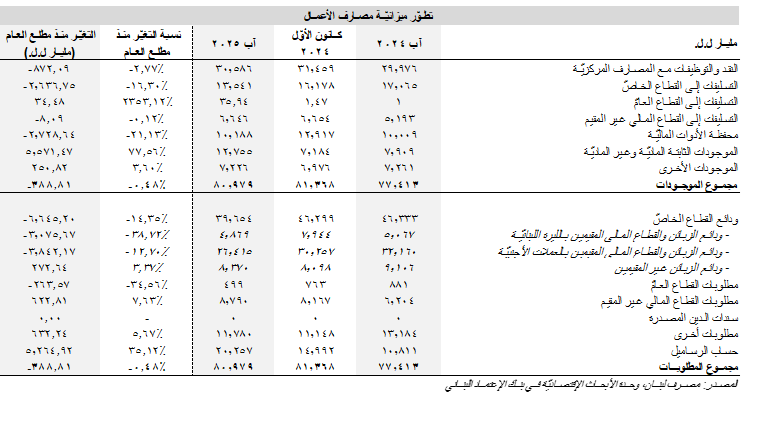 According to Banque Du Liban (BDL) statistics, the combined balance sheet of investment banks operating in Lebanon narrowed by 0.48% (LBP 388.81 billion) during the first eight months of 2025 to LBP 80,979 billion, down from LBP 81,368 billion at end of 2024. In details, claims on the private sector (comprising resident and non-resident customers) dropped by 16.30% (LBP 2,636.75 billion) to LBP 13,541 billion and were accompanied by some 2.77% (LBP 872.09 billion) decrease in cash and deposits with Central Banks to LBP 30,586 billion and some 21.13% (LBP 2,728.64 billion) drop in the value of the securities portfolio to LBP 10,188 billion, which together outweighed the 77.56% (LBP 5,571.47 billion) rise in the value of fixed assets to LBP 12,755 billion and the 2,353.12% (LBP 34.48 billion) hike in claims on the public sector to LBP 35.94 billion. On the liabilities side, private sector deposits (resident and non-resident deposits in addition to resident financial sector deposits) fell by 14.35% (LBP 6,645.20 billion) in the first eight months of 2025 to LBP 39,654 billion, and were accompanied by some 34.56% (263.57 billion) drop in liabilities to the public sector to LBP 499 billion, which eroded the 35.12% (LBP 5,264.92 billion) increase in investment banks’ capital accounts to LBP 20,257 billion, the 5.67% (LBP 632.24 billion) increase in other liabilities to LBP 11,780 billion, and the 7.63% (LBP 622.81 billion) increase in liabilities to the non-resident financial sector to LBP 8,790 billion.