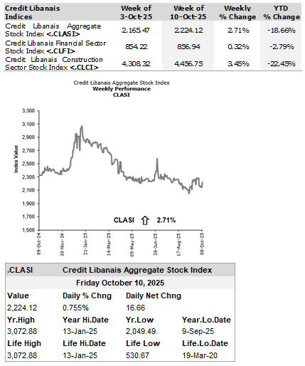 Four gaining and one losing stock were screened week-on-week, lifting the BSE’s market capitalization up by 2.62% to around $20.38 billion and the Credit Libanais Aggregate Stock Index (“CLASI”) higher by 2.71% to 2,224.12.