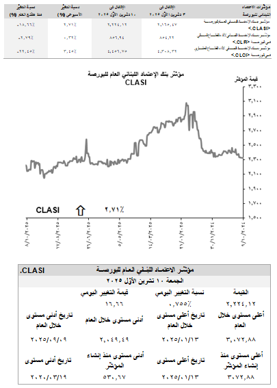 من جهةٍ أخرى، إرتفعت الرسملة السوقيّة (Market Capitalization) لبورصة بيروت بنسبة 2.62% على صعيد أسبوعي إلى حوالي 20.38 مليار د.أ.، وذلك في ظلّ الزيادة في أسعار أربعة أسهم والتراجع في سعر سهم آخر. في هذا الإطار، أنهى مؤشِّر بنك الإعتماد اللبناني للبورصة (“CLASI”) أسبوعه على إرتفاع بنسبة 2.71% عن إقفال الأسبوع السابق ليصل إلى 2،224.12.