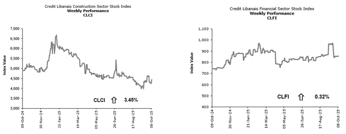 In the banking sector, BLOM Bank listed shares amassed the highest concentration of trades (18.63% of total BSE traded volume) with a thin turnover ratio of 0.002%. The Credit Libanais Financial Sector Stock Index (“CLFI”) closed Friday’s session higher by 0.32% w-o-w at 856.94 amid the 0.97% weekly appreciation in the price of BLOM Bank listed shares to $5.21 and the 0.69% rise in the price of BLOM Bank GDRs to $7.25.