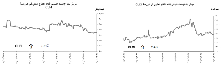 أمّا في القطاع المصرفي، فقد إستحوذت الأسهم العاديّة التابعة لبنك لبنان والمهجر على حصّة الأسد (18.63%) من مجموع عدد الأسهُم المتداوَلة خلال الأسبوع المعني. من جهته، أنهى مؤشِّر بنك الإعتماد اللبناني لأداء القطاع المالي في البورصة (“CLFI”) أسبوعه على إرتفاع بنسبة 0.32% إلى 856.94 في ظلّ التحسّن في سعر الأسهم العاديّة التابعة لبنك لبنان والمهجر بنسبة 0.97% إلى 5.21 د.أ. والزيادة في سعر شهادات الإيداع التابعة لبنك لبنان والمهجر بنسبة 0.69% إلى 7.25 د.أ.
