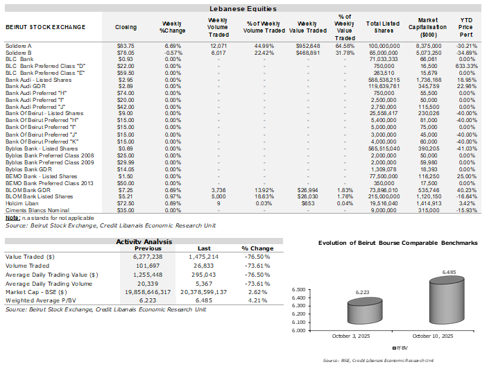 Activity on the Beirut Stock Exchange (BSE) continued heading downstream during the week of October 10 with the number of shares changing hands dropping to 26,833 shares compared to 101,697 shares in the week before and value traded decreasing to $1.48 million compared to $6.28 million a week earlier. Trades were concentrated in real estate sector stocks, which accounted for 67.44% of weekly traded volume.
