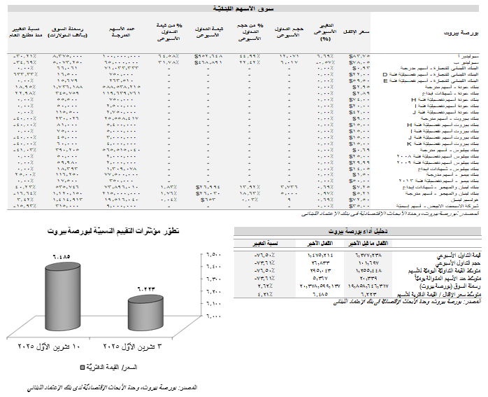 تابعت حركة التداول على بورصة بيروت مسارها الإنحداري في الأسبوع المنتهي في 10 تشرين الأوّل حيث إنخفض عدد الأسهُم المتداوَلة إلى 26،833 سهم، مقارنةً ب101،697 سهم في الأسبوع الذي سبقه كما وتدنّت قيمة الأسهم المتداولة إلى 1.48 مليون د.أ.، مقارنةً ب6.28 مليون د.أ. قبل أسبوع. وقد سَيطَرَت أسهُم القطاع العقاري على الحصّة الأكبر من حجم التداول مشكّلةً نسبة 67.44% من مجموع عدد الأسهم المتداولة.