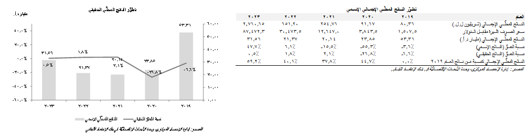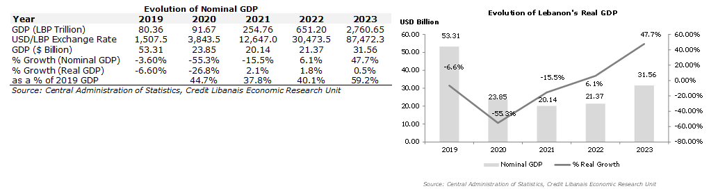 أَصدَرت إدارة الإحصاء المركزي تقريرها حول "الحسابات القوميّة السنويّة " للعام 2023 والذي تسلّط من خلاله الضوء على تطوُّر الناتج المحلّي الإجمالي في لبنان وتقسيمه بحسب القطاعات الإقتصاديّة. وقدَّمت الإدارة بيانات الناتج المحلّي الإجمالي بالليرة اللبنانيّة وبالدولار الأميركي بإستخدام أسعار الصرف التي قدّرتها، والتي إرتفعت من 1,507.5 ليرة لبنانيّة للدولار في العام 2019 إلى 12,647.0 ليرة لبنانيّة للدولار في العام 2021 و87,472.3 ليرة لبنانيّة للدولار في العام 2023 (وهو سعر قريب من سعر الصرف الرسمي السائد حالياً). بالأرقام، وصل الناتج المحلّي الإجمالي الاسمي للبنان إلى أدنى مستوى له عند 20.14 مليار د.أ. في العام 2021 (حوالي 38% من الناتج المحلي الإجمالي للعام 2019 البالغ 53.31 مليار د.أ.)، قبل أن يتحسّن إلى 21.37 مليار د.أ. في العام 2022 (حوالي 40% من مستوى العام 2019) و31.56 مليار د.أ. في العام 2023 (حوالي 59% من ناتج العام 2019). أما بالنسبة للنموّ الحقيقي (الذي تستبعد تأثير التضخّم)، فقد عاد النمو إلى مستويات إيجابيّة في العام 2021 (2.1%) قبل أن يتراجع إلى 1.8% في العام 2022 و0.5% في العام 2023. وقد أوضحت إدارة الإحصاء المركزي بأنّ أرقامها تتضمن أثر الإقتصاد غير الرسمي والذي قدّرته بنحو 30% من الناتج المحلّي الإجمالي.
