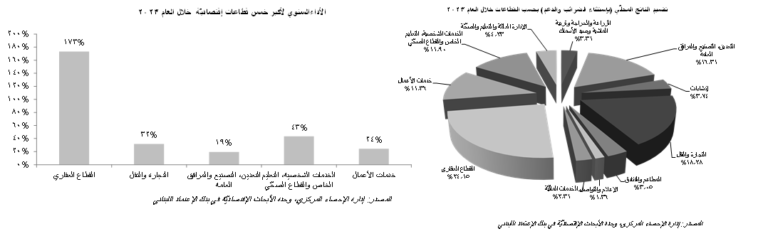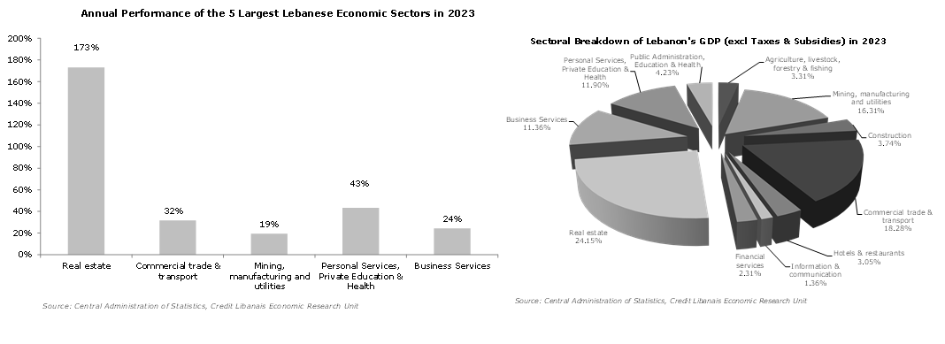 وقد برز قطاع العقارات كأكبر مساهم في الناتج المحلّي الإجمالي (عند إقتطاع الضرائب والدعم) في العام 2023 بنسبة 24.2%، يليه قطاع التجارة والنقل (18.3%)، وقطاع التعدين والتصنيع والمرافق العامّة (16.3%)، وقطاع الخدمات الشخصيّة والتعليم والإستشفاء الخاص (11.9%)، وقطاع خدمات الأعمال (11.4%). وفيما يتعلّق بالأداء السنوي لأكبر خمس قطاعات، كان قطاع العقارات الأفضل أداءً في العام 2023 (نمو بنسبة 173٪) يليه قطاع الخدمات الشخصيّة والتعليم والإستشفاء الخاص (نمو بنسبة 43٪) والتجارة والنقل (نمو بنسبة 32٪) على سبيل المثال لا الحصر، كما هو موضح في الرسم البياني التالي: