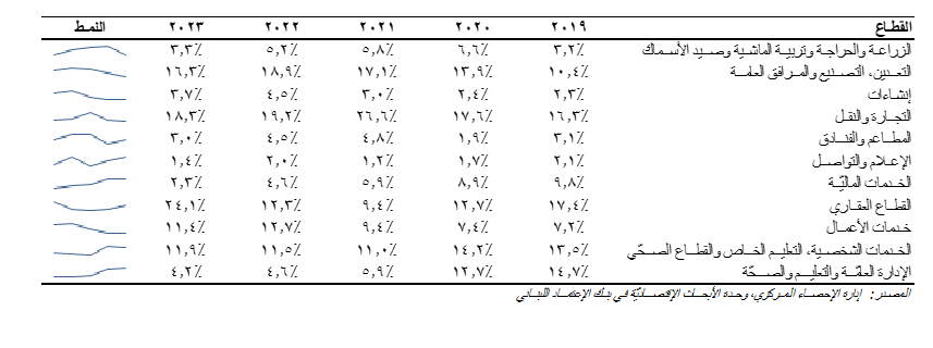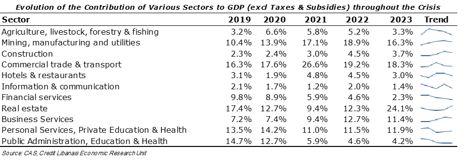 كما هو موضح في الجدول أدناه، يتضح بأنّه كان للأزمة تأثير هائل على قطاع الخدمات الماليّة الذي إنخفضت مساهمته من الناتج المحلّي الإجمالي حوالي 10% في العام 2019 إلى حوالي 2.3% في العام 2023. وينطبق الأمر نفسه على قطاع الإدارة العامة والتعليم والصحة، حيث تدهورت مساهمته من 14.7% من الناتج المحلّي الإجمالي إلى 4.2% خلال الفترة الممتدّة بين عاميّ 2019 و2023. وإنخفضت مساهمة القطاع العقاري من 12.7% في العام 2020 لتصل إلى 9.4% في العام 2021 قبل أن تنتعش إلى حوالي 24% بنهاية العام 2023. ومن القطاعات الأخرى التي حققت أداءً قويّاً خلال الأزمة قطاع التعدين والتصنيع والمرافق، حيث ارتفعت مساهمته من 10.4% من الناتج المحلّي الإجمالي في العام 2019 إلى 18.9% في العام 2022، قبل أن تنخفض إلى 16.3% في عام 2023.