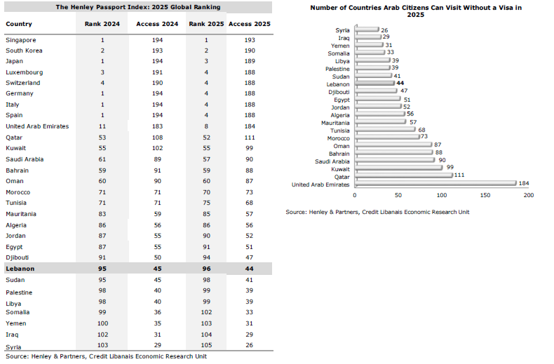 On a regional basis, the United Arab Emirates was the fastest climber in the world in the last 15 years, rising from the 65th place in 2010 to the 8th place in the world in the 2025 index (184 visa-free countries or visa on arrival) and once more consolidating its first place in the region. Qatar came in second among its Arab peers and 52nd in the world (111 visa-free countries or visa on arrival) in the 2025 Henley Passport Index, followed by Kuwait (global rank: 55; 99 visa-free countries or visa on arrival), and Saudi Arabia (global rank: 57; 90 visa-free countries or visa on arrival), only to name a few. Lebanon ranked 96th in the world and 14th in the Arab region in the 2025 Henley Passport Index ceding 1 position when compared to the 95th place it occupied in the index of the previous year, with a Lebanese passport-holder being eligible to visit a total of 44 visa-free (or visa on arrival) countries, down from 45 in the year 2024.