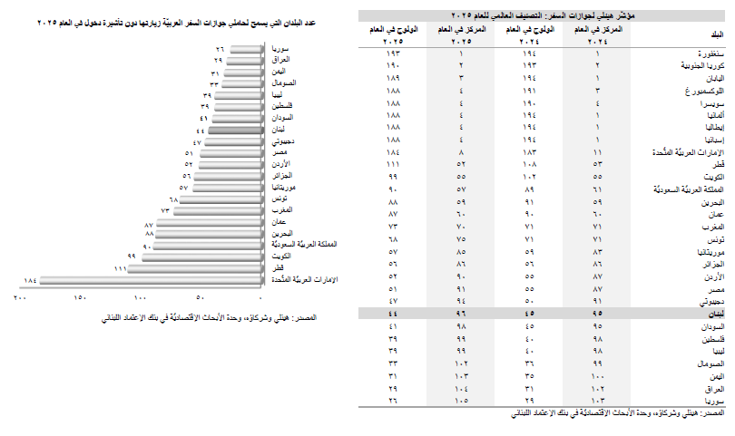 على صعيدٍ إقليميٍّ، حقّقت الإمارات العربية المتحدة التقدم الأسرع في العالم خلال الأعوام ال15 الماضية بحيث أتت في المركز الثامن عالميّاً في مؤشّر العام 2025 متقدّمةً من المركز 65 في العام 2010، كما وعزّزت مركزها الأول لمرّة جديدة في المنطقة بحيث بلغ عدد البلدان المسموح دخولها دون تأشيرة أو بتأشيرة عند الوصول 184. وقد إحتلّت قطر المرتبة الثانية بين نظرائها العرب والمرتبة 52 عالميّاً (عدد البلدان التي يمكن زيارتها دون تأشيرة أو بتأشيرة عند الوصول: 111) في مؤشّر العام 2025، تبعتها الكويت (المرتبة 55 عالميّاً؛ عدد البلدان التي يمكن زيارتها دون تأشيرة أو بتأشيرة عند الوصول: 99) والمملكة العربيّة السعوديّة (المرتبة 57 عالميّاً؛ عدد البلدان التي يمكن زيارتها دون تأشيرة أو بتأشيرة عند الوصول: 90)، للذكر لا للحصر. أمّا على الصعيد المحلي، فقد أتى لبنان في المرتبة 96 عالميّاً وال14 بين نظرائه العرب في مؤشّر هينلي لجوازات السفر عن العام 2025 متراجعاً بمرتبة واحدة عن ترتيبه في مؤشّر العام السابق. بذلك، بلغ عدد الدول التي يُسمح لحاملي جوازات السفر اللبنانيّة زيارتها دون تأشيرة أو مع تأشيرة عند الدخول إلى مطاراتها 44 بلداً، مقارنةً ب45 بلداً في العام 2024.
