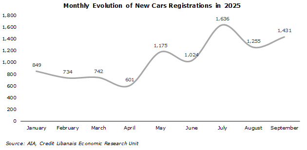 إستناداً إلى إحصاءات جمعيّة مستوردي السيّارات، زادت حركة تسجيل السيّارات الجديدة في لبنان حيث بلغ عدد السيّارات الجديدة المسجّلة 1،431 سيّارة خلال الشهر التاسع من العام 2025 مقارنةً مع 1،225 سيّارة في شهر آب و1،636 سيّارة في شهر تمّوز للذكر لا الحصر كما هو مبيّن في البيان التالي: