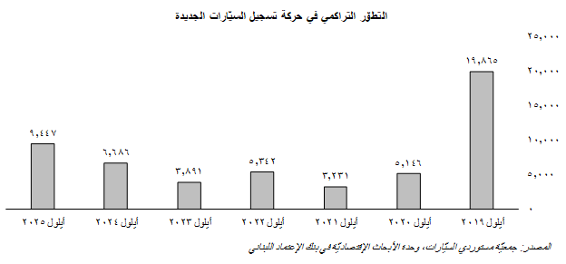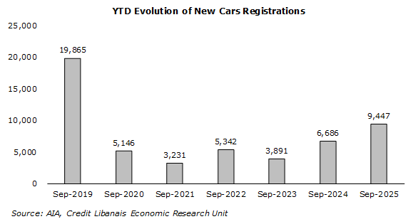 كذلك على صعيد تراكمي، فقد زاد عدد السيّارات الجديدة المسجّلة بنسبة سنويّة بلغت 41.30% ليصل إلى 9،447 سيّارة مع نهاية الأشهر التسعة الأولى من العام 2025 مقارنةً بمستوى ال6،686 سيّارة المسجّل قبل عام نتيجة التحسّن في المشهدين السياسي والأمني كما وتطبيق بعض الإصلاحات في مصلحة تسجيل السيّارات. إلّا إنّ هذه الأرقام تبقى خجولة مقارنةً بمستويات ما قبل الأزمة حين تمّ تسجيل حوالي ال19،865 سيّارة جديدة خلال الأشهر التسعة الأولى من العام 2019.