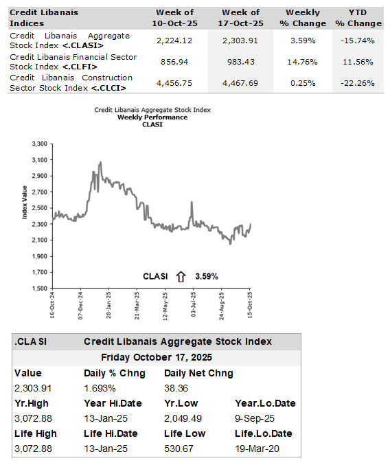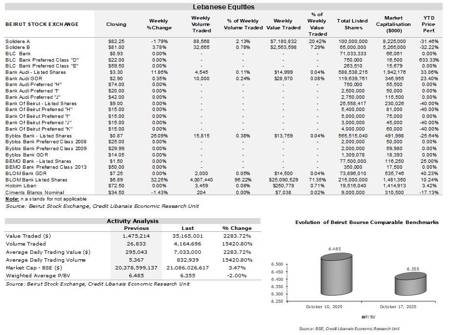Activity on the Beirut Stock Exchange (BSE) registered a notable increase during the week of October 17 with the number of shares changing hands increasing substantially to 4,164,696 shares compared to 26,833 shares in the week before and value traded soaring to $35.17 million compared to $1.48 million a week earlier. Trades were concentrated in banking sector stocks, which accounted for 97.00% of weekly traded volume.