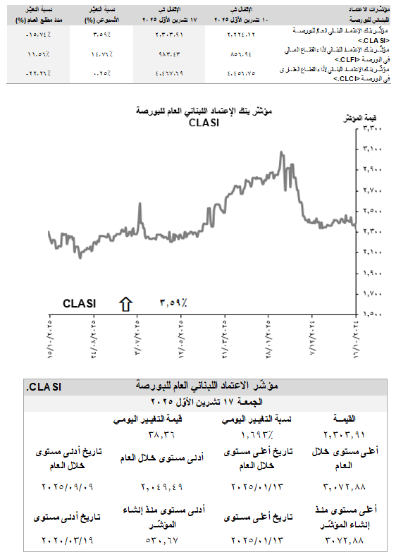 من جهةٍ أخرى، إرتفعت الرسملة السوقيّة (Market Capitalization) لبورصة بيروت بنسبة 3.47% على صعيد أسبوعي إلى حوالي 21.09 مليار د.أ.، وذلك في ظلّ الزيادة في أسعار خمسة أسهم والتراجع في سعر سهمين آخرين. في هذا الإطار، أنهى مؤشِّر بنك الإعتماد اللبناني للبورصة (“CLASI”) أسبوعه على إرتفاع بنسبة 3.59% عن إقفال الأسبوع السابق ليصل إلى 2،303.91.