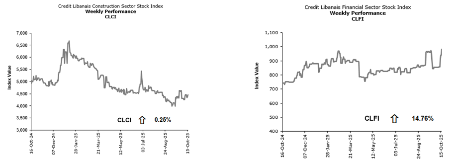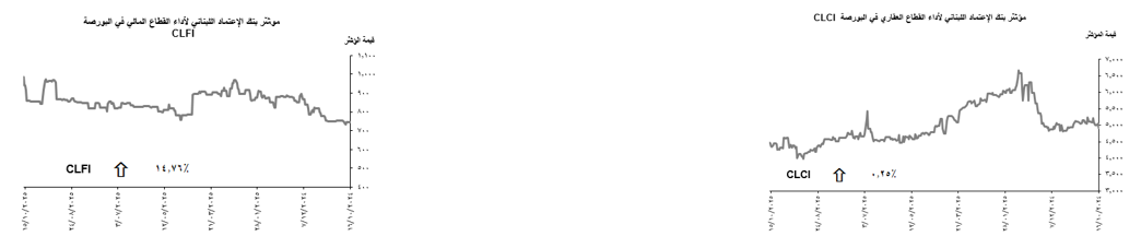 أمّا في القطاع المصرفي، فقد إستحوذت الأسهم العاديّة التابعة لبنك لبنان والمهجر على حصّة الأسد (96.22%) من مجموع عدد الأسهُم المتداوَلة خلال الأسبوع المعني. من جهته، أنهى مؤشِّر بنك الإعتماد اللبناني لأداء القطاع المالي في البورصة (“CLFI”) أسبوعه على إرتفاع بنسبة 14.76% لبصل إلى أعلى مستوى له في هذا العام عند 983.43 في ظلّ التحسّن في سعر الأسهم العاديّة التابعة لبنك لبنان والمهجر بنسبة 32.25% إلى 6.89 د.أ. والزيادة في سعر الأسهم العاديّة التابعة لبنك بيبلوس بنسبة 26.09% إلى 0.87 د.أ. وإرتفاع سعر الأسهم العاديّة التابعة لبنك عوده بنسبة 11.86% إلى 3.30 د.أ. وزادة سعر شهادات الإيداع التابعة لبنك عوده بنسبة 0.35% إلى 2.90 د.أ.