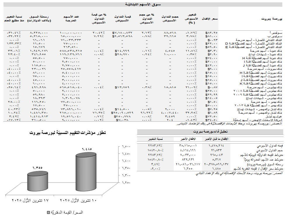 شهدت حركة التداول على بورصة بيروت إرتفاعاً ملحوظاً في الأسبوع المنتهي في 17 تشرين الأوّل حيث زاد عدد الأسهُم المتداوَلة بشكلٍ لافت إلى 4،164،696 سهم، مقارنةً ب26،833 سهم في الأسبوع الذي سبقه كما وإرتفعت قيمة الأسهم المتداولة إلى 35.17 مليون د.أ.، مقارنةً ب1.48 مليون د.أ. قبل أسبوع. وقد سَيطَرَت أسهُم القطاع المصرفي على الحصّة الأكبر من حجم التداول مشكّلةً نسبة 97.00% من مجموع عدد الأسهم المتداولة.