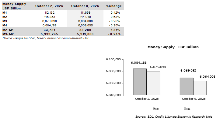 All monetary aggregates ended the week of October 9, 2025 on a negative note. In fact, the overall money supply, “M4”, narrowed by LBP 15,092.51 billion on a weekly basis to LBP 6,069.10 trillion, noting that the non-banking sector’s Treasury bills portfolio decreased by LBP 2.96 billion during the concerned week.