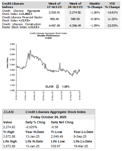 Four losing and four gaining stocks were screened week-on-week, dragging the BSE’s market capitalization down by 1.22% to around $20.83 billion and the Credit Libanais Aggregate Stock Index (“CLASI”) lower by 1.26% to 2,274.82.
