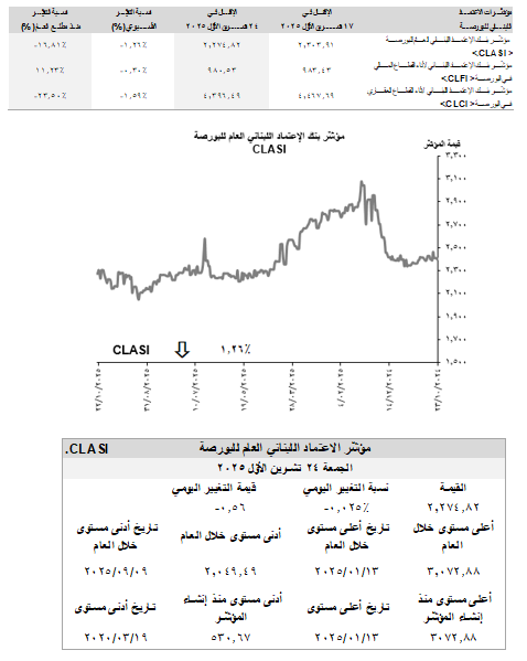 من جهةٍ أخرى، إنخفضت الرسملة السوقيّة (Market Capitalization) لبورصة بيروت بنسبة 1.22% على صعيد أسبوعي إلى حوالي 20.83 مليار د.أ.، وذلك في ظلّ التراجع في أسعار أربعة أسهم والتحسّن في أسعار أربعة أسهم أخرى. في هذا الإطار، أنهى مؤشِّر بنك الإعتماد اللبناني للبورصة (“CLASI”) أسبوعه على إنخفاض بنسبة 1.26% عن إقفال الأسبوع السابق ليصل إلى 2،274.82.