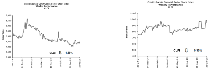 In the real estate sector, trades mainly consisted of Solidere “A” and “B” shares (29.09% of weekly traded volume) with the price of Solidere “A” shares dropping by 1.28% w-o-w to $81.20 and that of Solidere “B” decreasing by 3.58% to $78.10. The prices of Holcim Liban and Ciments Blancs Nominal shares, however, rose by 1.38% and 10.14% w-o-w to $73.50 and $38.00 respectively. Consequently, the Credit Libanais Construction Sector Stock Index (“CLCI”) ended Friday’s session down by 1.59% on a weekly basis at 4,396.49.