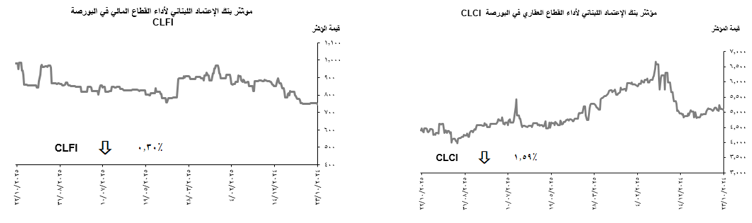 أمّا في القطاع المصرفي، فقد إستحوذت الأسهم العاديّة التابعة لبنك لبنان والمهجر على حصّة الأسد (60.32%) من مجموع عدد الأسهُم المتداوَلة خلال الأسبوع المعني. من جهته، أنهى مؤشِّر بنك الإعتماد اللبناني لأداء القطاع المالي في البورصة (“CLFI”) أسبوعه على إنخفاض بنسبة 0.30% ليصل إلى 980.53 في ظلّ التراجع في سعر الأسهم العاديّة التابعة لبنك عوده بنسبة 9.39% إلى 2.99 د.أ. وتدنّي سعر شهادات الإيداع التابعة لبنك لبنان والمهجر بنسبة 0.69% إلى 7.20 د.أ.، ما طغى على الإرتفاع في سعر الأسهم العاديّة التابعة لبنك لبنان والمهجر بنسبة 8.85% إلى 7.50 د.أ. والزيادة في سعر الأسهم العاديّة التابعة لبنك بيبلوس بنسبة 8.05% إلى 0.94 د.أ.