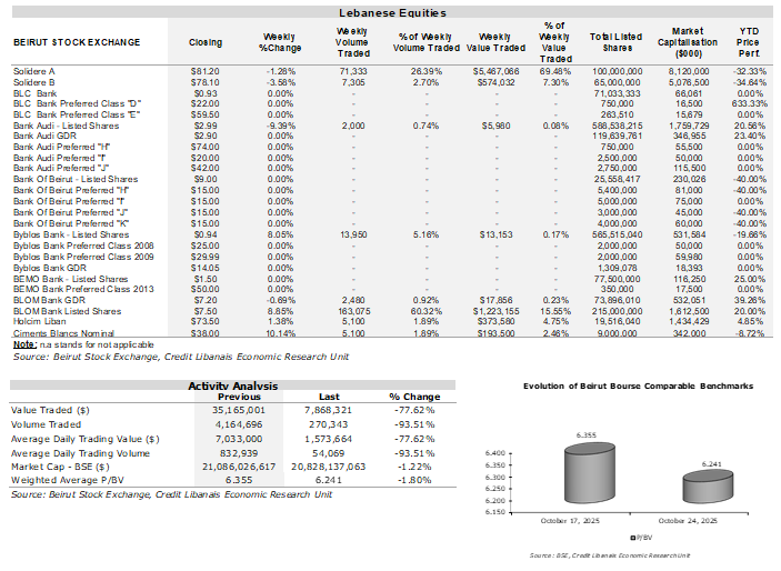 Activity on the Beirut Stock Exchange (BSE) was sluggish during the week of October 24 with the number of shares changing hands decreasing to 270,343 shares compared to 4,164,696 shares in the week before and value traded dropping to $7.87 million compared to $35.17 million a week earlier. Trades were concentrated in banking sector stocks, which accounted for 67.14% of weekly traded volume.
