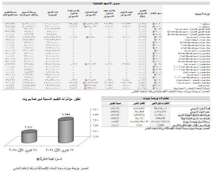 ضَعِفَت حركة التداول على بورصة بيروت في الأسبوع المنتهي في 24 تشرين الأوّل حيث إنخفض عدد الأسهُم المتداوَلة إلى 270،343 سهم، مقارنةً ب4،164،696 سهم في الأسبوع الذي سبقه كما وتدنّت قيمة الأسهم المتداولة إلى 7.87 مليون د.أ.، مقارنةً ب35.17 مليون د.أ. قبل أسبوع. وقد سَيطَرَت أسهُم القطاع المصرفي على الحصّة الأكبر من حجم التداول مشكّلةً نسبة 67.14% من مجموع عدد الأسهم المتداولة.