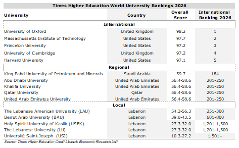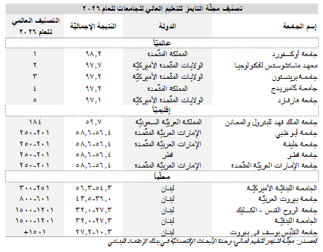 أصدرت مجلّة التايمز للتعليم العالي (THE) مؤخّراً تصنيفها للجامعات حول العالم للعام 2026 والتي تصنّف من خلاله 2،191 جامعة حسب مجموعة من المعايير المُثقّلة ألا وهي البيئة التعليميّة (29.5%)، بيئة الأبحاث (29.0%)، نوعيّة الأبحاث (30.0%)، النظرة العالميّة (7.5%) والدخل المالي (4.0%). وقد برزت جامعتين من المملكة المتّحدة ألا وهما جامعة أوكسفورد التي إحتلّت المرتبة الأولى في العالم بنتيجة 98.2 وجامعة كامبريدج (الرابعة عالميّاً بنتيجة 97.2). كما وظهرت ثلاث جامعات أميركيّة ضمن أفضل خمس جامعات حول العالم بحيث إحتلّ معهد ماساتشوستس للتكنولوجيا المركز الثاني (نتيجة 97.7) وجامعة برينستون المرتبة الثالثة (نتيجة 97.2) وجامعة هارفارد المركز الخامس (نتيجة 97.1).