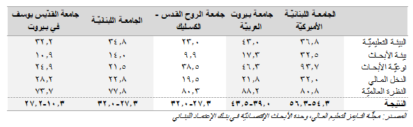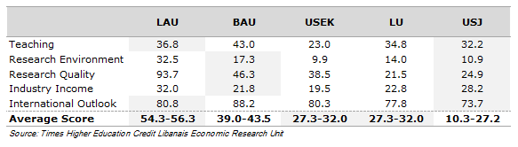 Locally, Times Higher Education ranked five Lebanese universities in the THE list led by the Lebanese American University (overall score: 54.3-56.3; international rank: 251-300), followed by the Beirut Arab University with a score of (39.0-43.5) and an international rank of (601-800), each of the Holy Spirit University of Kaslik and the Lebanese University with a score of (27.3-32.0) and an international rank of (1,201-1,500) and Université Saint-Joseph de Beyrouth (score: 10.3-27.2; international rank: 1,501+). It is worth noting that the American University of Beirut was excluded from the local rankings based a decision by the university to withdraw from the rankings over credibility concerns as per a statement dated September 11 published on the university’s website. The Lebanese American University fared best in three criterions namely research environment (score: 32.5), research quality (score: 93.7), and industry income (score: 32.0), while the Beirut Arab University topped the teaching criterion (score: 43.0) and international outlook criterion (score: 88.2).