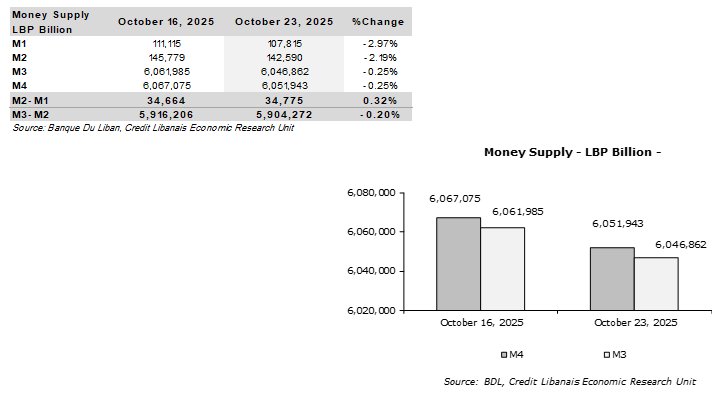 All monetary aggregates ended the week of October 23, 2025 on a negative note. In fact, the overall money supply, “M4”, narrowed by LBP 15,132.17 billion on a weekly basis to LBP 6,051.94 trillion, noting that the non-banking sector’s Treasury bills portfolio decreased by LBP 9.30 billion during the concerned week.