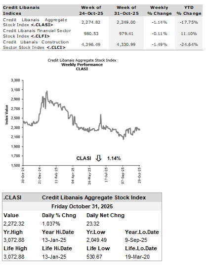 Three losing and one gaining stock were screened week-on-week, dragging the BSE’s market capitalization down by 1.10% to around $20.60 billion and the Credit Libanais Aggregate Stock Index (“CLASI”) lower by 1.14% to 2,249.00.