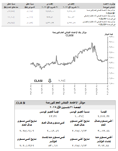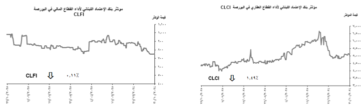 أمّا في القطاع المصرفي، فقد إستحوذت الأسهم العاديّة التابعة لبنك عوده على حصّة الأسد (2.68%) من مجموع عدد الأسهُم المتداوَلة خلال الأسبوع المعني. من جهته، أنهى مؤشِّر بنك الإعتماد اللبناني لأداء القطاع المالي في البورصة (“CLFI”) أسبوعه على إنخفاض بنسبة 0.11% ليصل إلى 979.41 في ظلّ التراجع في سعر الأسهم العاديّة التابعة لبنك عوده بنسبة 0.33% إلى 2.98 د.أ. وغياب أيّ زيادة في أسعار أسهم مصرفيّة أخرى مدرجة.
