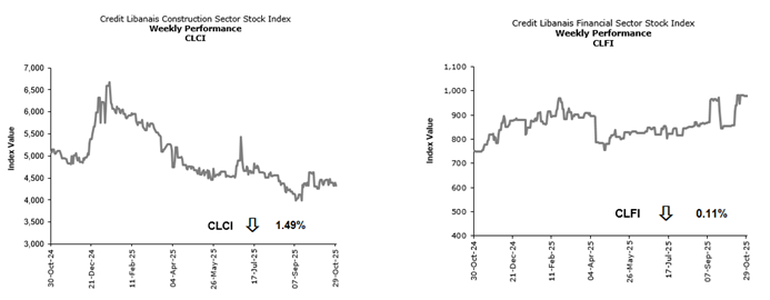 In the banking sector, Bank Audi listed shares amassed the highest concentration of trades (2.68% of total BSE traded volume) with a thin turnover ratio of 0.001%. The Credit Libanais Financial Sector Stock Index (“CLFI”) closed Friday’s session lower by 0.11% w-o-w at 979.41 amid the 0.33% weekly drop in the price of Bank Audi listed shares to $2.98 and the absence of any price gainers among listed banking stocks.