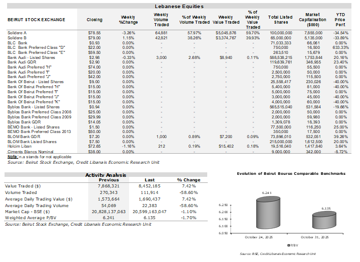 Activity on the Beirut Stock Exchange (BSE) continued heading South during the week of October 31 with the number of shares changing hands decreasing to 111,914 shares compared to 270,343 shares in the week before and value traded rising to $8.45 million compared to $7.87 million a week earlier. Trades were concentrated in real estate sector stocks, which accounted for 96.43% of weekly traded volume.