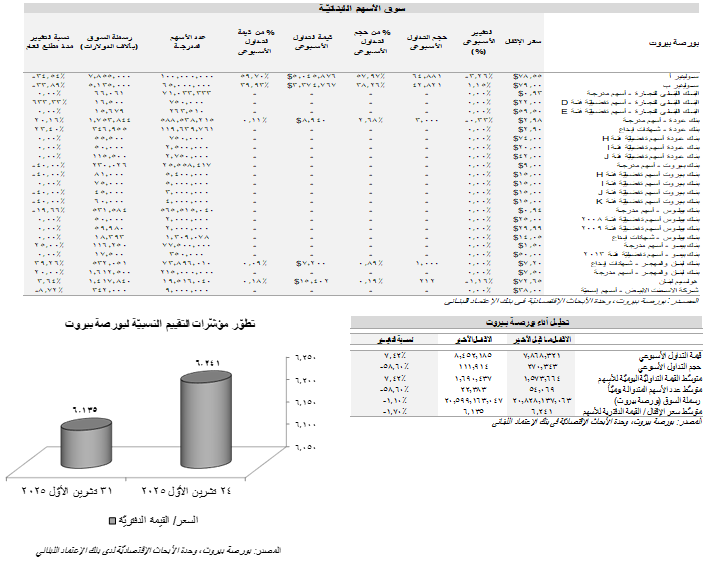 من جهّته، أنهى المتوسّط المثقَّل للسعر على القيمة الدفتريّة (P/BV) للأسهُم المدرَجة على بورصة بيروت أسبوعه على إنخفاض ليصل إلى 6.135 بحسب أسعار إقفال نهار الجمعة مقارنةً بمستوى بلغ 6.241 في نهاية الأسبوع السابق.