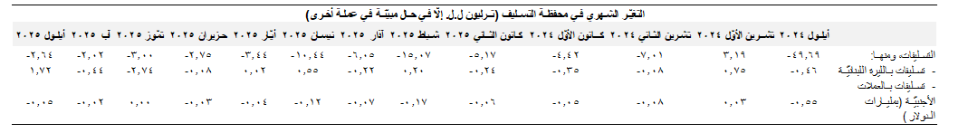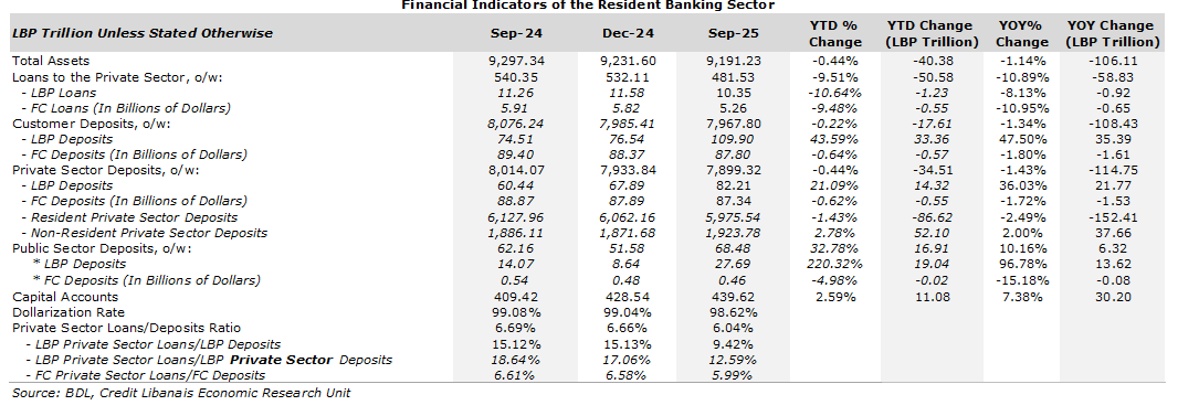 في المقلب الآخر، إنكمشت تسليفات المصارف اللبنانيّة إلى القطاع الخاصّ (المقيمين وغير المقيمين) بنسبة 9.51% (50.58 ترليون ل.ل.) خلال الأشهر التسعة الأولى من العام 2025 إلى 481.53 ترليون ل.ل. مقابل 532.11 ترليون ل.ل. في نهاية العام 2024. بالتفاصيل، فقد تراجعت التسليفات المعنونة بالليرة اللبنانيّة بنسبة 10.64% (1.23 ترليون ل.ل.) خلال الأشهر التسعة الأولى من العام 2025 إلى 10.35 ترليون ل.ل.، كما وإنخفضت التسليفات المعنونة بالعملات الأجنبيّة بنسبة 9.48% (551.39 مليون د.أ.) إلى 5.26 مليار د.أ. على صعيد شهري، إرتفعت التسليفات المعنونة بالليرة اللبنانيّة ب1.72 ترليون ل.ل. في حين إنكمشت تلك المعنونة بالعملات الأجنبيّة ب48.66 مليون د.أ وقد وصل معدّل التسليفات من ودائع الزبائن إلى 6.04% في نهاية شهر أيلول 2025، مقابل 6.66% في نهاية العام 2024 و6.69% في نهاية شهر أيلول 2024. في التفاصيل، وصلت نسبة التسليفات إلى القطاع الخاصّ المعنونة بالليرة اللبنانيّة من مجموع الودائع المعنونة بالعملة الوطنيّة إلى 9.42% في شهر أيلول 2025، مقارنةً مع 15.13% في نهاية العام 2024 و15.12% قبل عام كما وإنخفض معدّل التسليفات المعنونة بالعملات الأجنبيّة إلى 5.99% من مجموع الودائع بالعملات الأجنبيّة، من 6.58% في نهاية العام 2024 و6.61% في أيلول 2024. على صعيد سنوي، إنكمشت محفظة التسليفات بنسبة 10.89% (58.83 ترليون ل.ل.) عند مقارنتها بالمستوى الذي كانت عليه في شهر أيلول 2024 والبالغ حينها 540.35 ترليون ل.ل.