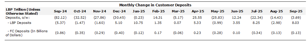 On the funding side of the balance sheet, customer deposits dropped by 0.22% (LBP 17.61 trillion) YTD September 2025 to LBP 7,967.80 trillion with resident private sector deposits decreasing by 1.43% (LBP 86.62 trillion) to LBP 5,975.54 trillion, non-resident private sector deposits increasing by 2.78% (LBP 52.10 trillion) to LBP 1,923.78 trillion, and public sector deposits rallying by 32.78% (LBP 16.91 trillion) to LBP 68.48 trillion. From a currency denomination standpoint, deposits in Lebanese Pounds rose by 43.59% (LBP 33.36 trillion) YTD September to LBP 109.90 trillion while foreign currency deposits dropped by 0.64% ($569.48 million) to $87.80 billion. On a monthly basis, LBP deposits increased by LBP 8.03 trillion in September with FC deposits decreasing by $130.94 million. In this context, the deposit dollarization rate reached 98.62% at end of September 2025 in comparison with 99.04% at end of year 2024 and 99.08% a year earlier. On an annual basis, total customer deposits narrowed by 1.34% (LBP 108.43 trillion) from a reading of LBP 8,076.24 trillion at end of September 2024.