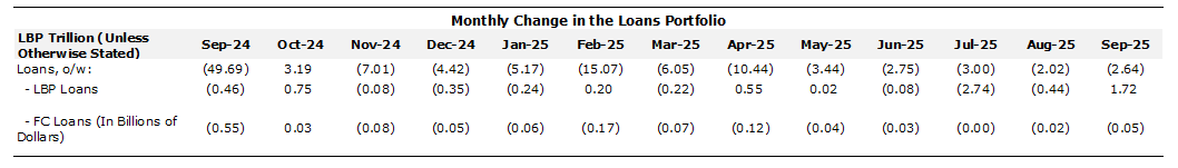 On the lending front, loans to the private sector (residents and non-residents) receded by 9.51% (LBP 50.58 trillion) during the first nine months of 2025 to LBP 481.53 trillion, down from LBP 532.11 trillion in December 2024. More specifically, LBP denominated loans decreased by 10.64% (LBP 1.23 trillion) YTD September 2025 to LBP 10.35 trillion with foreign currency loans dropping by 9.48% ($551.39 million) to $5.26 billion. On a monthly basis, LBP denominated loans increased by LBP 1.72 trillion with FC denominated ones contracting by $48.66 million. The ratio of loans to deposits attained 6.04% at end of September 2025 compared to 6.66% at end of 2024 and 6.69% at end of September of the previous year. More specifically, the ratio of LBP-denominated private sector loans to total LBP deposits stood at 9.42% in September compared to 15.13% in December 2024 and 15.12% a year earlier while the ratio of foreign currency-denominated private sector loans to total foreign currency deposits reached 5.99% at end of September 2025 in comparison with 6.58% at end of December 2024 and 6.61% a year earlier. On an annual basis, the loans portfolio also sank by 10.89% (LBP 58.83 trillion) from LBP 540.35 trillion at end of September 2024.