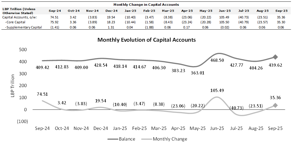 The combined capital accounts of commercial banks operating in Lebanon increased by 2.59% (the equivalent of $123.82 million or the counter value of LBP 11.08 trillion) in the first nine months of 2025 to LBP 439.62 trillion ($4.91 billion) from LBP 428.54 trillion ($4.79 billion) at end of year 2024. On a monthly basis, the combined capital accounts increased by LBP 35.36 trillion ($395.08 million) in September after having decreased by LBP 23.51 trillion ($262.72 million) in August. The monthly increase in the capital accounts of the resident banking sector may be attributed to the 9.15% ($249.61 million) appreciation in the value of “other securities” coupled with some 2.74% ($60.00 million) rise in the value of Lebanese sovereign Eurobonds. On an annual basis moreover, the combined equity of the resident banking sector rose by 7.38% (LBP 30.20 trillion, around $0.34 billion) when benchmarked to the LBP 409.42 trillion ($4.57 billion) reading reported at end of September 2024.