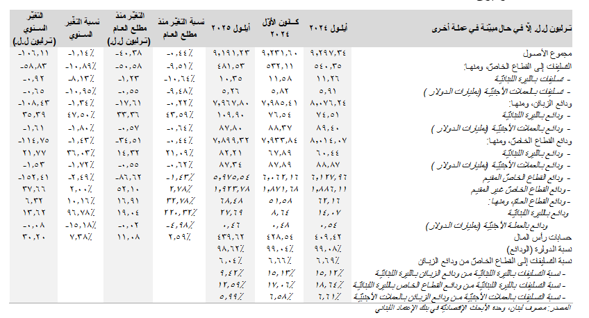 تُظهِر إحصاءات البنك المركزي إنخفاضاً بنسبة 0.44% (40.38 ترليون ل.ل.) في مجموع موجودات القطاع المصرفي المقيم خلال الأشهر التسعة الأولى من العام 2025 إلى 9،191.23 ترليون ل.ل. مقابِل 9،231.60 ترليون ل.ل. في نهاية العام 2024. كذلك على صعيدٍ سنويٍّ، فقد إنخفضت ميزانيّة القطاع المصرفي المقيم بنسبة 1.14% مقارنةً بالمستوى الذي كانت عليه في الشهر التاسع من العام 2024، والبالغ حينها 9،297.34 ترليون ل.ل.