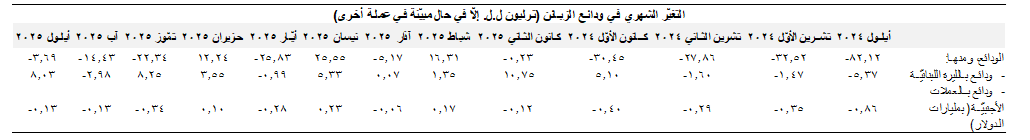 أمّا لجهة الموارد الماليّة، فقد إنخفضت ودائع الزبائن بنسبة 0.22% (17.61 ترليون ل.ل.) خلال الأشهر التسعة الأولى من العام 2025 إلى 7،967.80 ترليون ل.ل. مع تراجع ودائع القطاع الخاصّ المقيم بنسبة 1.43% (86.62 ترليون ل.ل.) إلى 5،975.54 ترليون ل.ل. وتطوّر ودائع القطاع الخاص غير المقيم بنسبة 2.78% (52.10 ترليون ل.ل.) إلى 1،923.78 ترليون ل.ل. وتسجيل ودائع القطاع العام زيادة بنسبة 32.78% (16.91 ترليون ل.ل.) إلى 68.48 ترليون ل.ل. وقد سجّلت ودائع الزبائن المعنونة بالليرة اللبنانيّة زيادة نسبتها 43.59% (33.36 ترليون ل.ل.) حتّى شهر أيلول 2025 إلى 109.90 ترليون ل.ل. فيما تراجعت الودائع المعنونة بالعملات الأجنبيّة بنسبة 0.64% (569.48 مليون د.أ.) إلى 87.80 مليار د.أ. على صعيد شهري، إرتفعت الودائع المعنونة بالليرة اللبنانيّة ب8.03 ترليون ل.ل. فيما إنخفضت تلك المعنونة بالعملات الأجنبيّة ب130.94 مليون د.أ. في هذا السياق، وصلت نسبة دولرة الودائع إلى 98.62% في نهاية شهر أيلول 2025 مقارنةً بنسبة 99.04% في نهاية العام 2024 و99.08% في نهاية شهر أيلول 2024. ويجدر الذكر بأنّ ودائع القطاع الخاص قد إنخفضت بنسبة سنويّة بلغت 1.34% (108.43 ترليون ل.ل.) مقارنةً بالمستوى الذي كانت عليه في شهر أيلول 2024 والبالغ حينها 8،076.24 ترليون ل.ل.