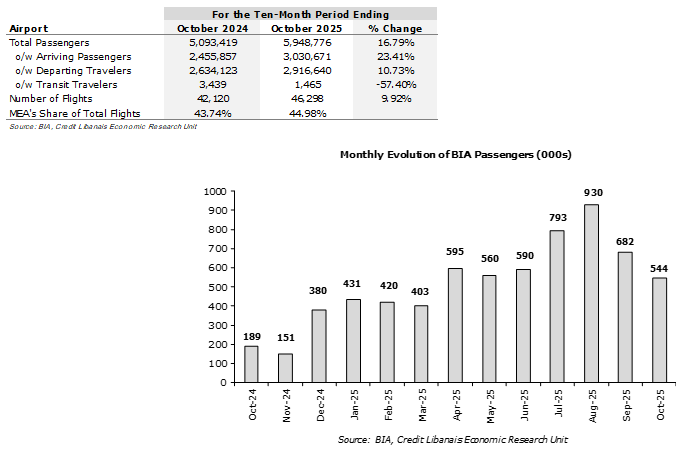 The number of passengers via the Beirut International Airport stood at 544,253 in October 2025, down by 20.16% month-on-month yet came in 187.86% higher y-o-y when compared to October 2024’s reading of 189,068 as a result of the Israeli aggression on Lebanon in the last quarter of 2024. The ratio of departing to arriving passengers stood at 1.07x in October compared to 1.30x in September and 1.34x in August. On a cumulative basis, the number of passengers rose by 16.79% y-o-y in the first ten months of 2025 to around 5.95 million, up from 5.09 million passengers in the same period in 2024. More specifically, the number of arriving travelers decreased by 11.38% m-o-m while increasing by 23.41% on an annual basis to 3.03 million YTD October, with the number of departing travelers ebbing by 26.96% m-o-m yet increasing by 10.73% y-o-y to 2.92 million. The number of transit travelers increased by 27.85% m-o-m while dropping by 57.40% over the same period in 2024 to 1,465 YTD October 2025. As to the number of flights, the latter saw a sharp monthly decrease of 13.95% in October and an annual rise of 9.92% during the first ten months of 2025 to 46,298. It is worth highlighting in this context that the share of Middle East Airlines (MEA) rose from 43.74% of the total number of flights in the first ten months of 2024 to 44.98% in the same period in 2025. This is further sketched in the section below:
