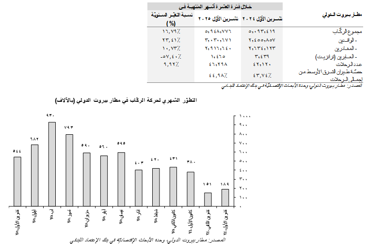 إنخفض عدد المسافرين عبر مطار بيروت الدولي بنسبة 20.16% في شهر تشرين الأوّل 2025 إلى 544،253 في حين زاد بنسبة سنويّة بلغت 187.86% مقارنةً بالمستوى المسجّل خلال شهر تشرين الأوّل 2024 والبالغ 189،068 وذلك بسبب العدوان الإسرائيلي على لبنان في الفصل الأخير من العام السابق. وقد وصل معدّل المسافرين المغادرين كسنبةً من المسافرين القادمين إلى حوالي ال1.07 في تشرين الأوّل مقارنةً ب1.30 في أيلول و1.34 في آب. على صعيد تراكمي، إرتفع عدد المسافرين بنسبة 16.79% سنويّاً في الأشهر العشرة الأولى من العام 2025 إلى حوالي 5.95 مليون مسافر مقارنةً بحوالي 5.09 مليون مسافر في الفترة نفسها من العام 2024. في التفاصيل، تراجع عدد الوافدين إلى لبنان بنسبة 11.38% على أساس شهريّ في حين زاد بنسبة 16.79% على أساسٍ سنويٍّ إلى 3.03 مليون مسافر حتّى شهر تشرين الأوّل الحالي. بالإضافة إلى ذلك، إنكمش عدد المغادرين بنسبة 26.96% على صعيد شهريّ في حين إرتفع بنسبة 10.73% على صعيد سنوي إلى 2.92 مليون مسافر في نهاية الأشهر العشرة الأولى من العام 2025. وقد إرتفع عدد العابرين عبر مطار بيروت (ترانزيت) بنسبة 27.85% على صعيد شهريّ في حين سجّل إنخفاضاً نسبته 57.40% على أساس سنويّ إلى 1،465 مسافر حتّى شهر تشرين الأوّل 2025. أمّا فيما يخصّ حركة الملاحة، فقد سجّل عدد الرحلات الجويّة إنخفاض شهريّ بلغت نسبته 13.95% في تشرين الأوّل وزيادة سنويّة بلغت نسبتها 9.92% خلال فترة الأشهر العشرة الأولى من العام 2025 إلى 46،298. يجدر الذكر أنّ حصّة طيران الشرق الأوسط من إجمالي عدد الرحلات قد تحسّنت من 43.74% في نهاية شهر تشرين الأوّل من العام 2024 إلى 44.98% في الفترة الموازية من العام 2025 كما هو مبيّن أدناه: