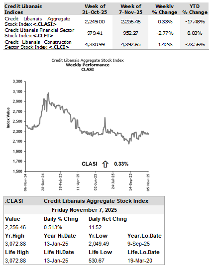 Three gaining and two losing stocks were screened week-on-week, lifting the BSE’s market capitalization up by 0.32% to around $20.67 billion and the Credit Libanais Aggregate Stock Index (“CLASI”) higher by 0.33% to 2,256.46.