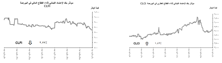 أمّا في القطاع المصرفي، فقد إستحوذت شهادات الإيداع التابعة لبنك لبنان والمهجر على حصّة الأسد (35.75%) من مجموع عدد الأسهُم المتداوَلة خلال الأسبوع المعني. من جهته، أنهى مؤشِّر بنك الإعتماد اللبناني لأداء القطاع المالي في البورصة (“CLFI”) أسبوعه متراجعاً بنسبة 2.77% عن إقفال الأسبوع السابق عند مستوى 952.27 في ظلّ تراجع سعر الأسهم العاديّة التابعة لبنك عوده بنسبة 9.40% إلى 2.70 د.أ. وإنخفاض سعر شهادات الإيداع التابعة لبنك عوده بنسبة 0.34% إلى 2.89 د.أ.، ما طغى على الزيادة بنسبة 4.17% في سعر شهادات الإيداع التابعة لبنك لبنان والمهجر إلى 7.50 د.أ.
